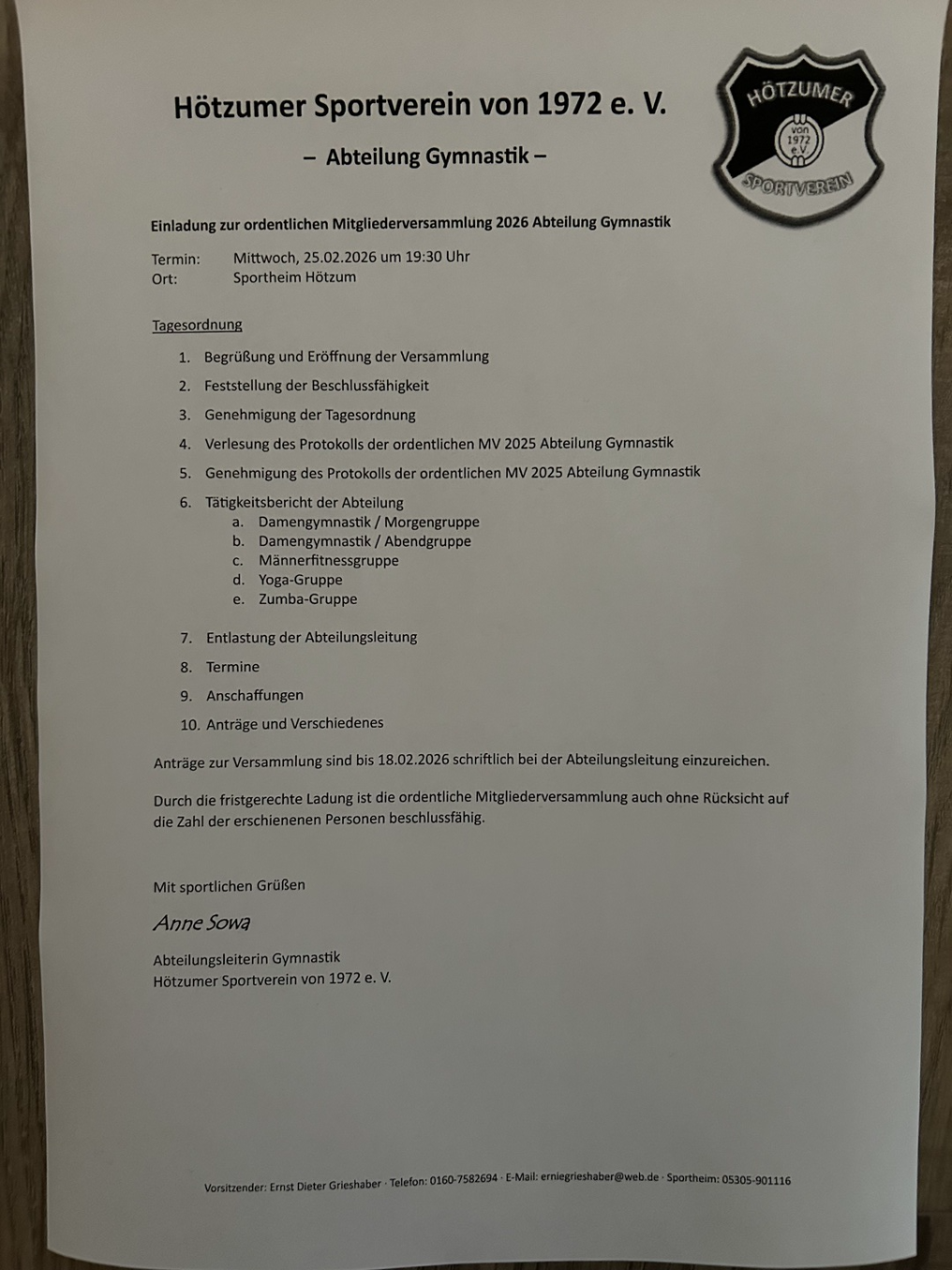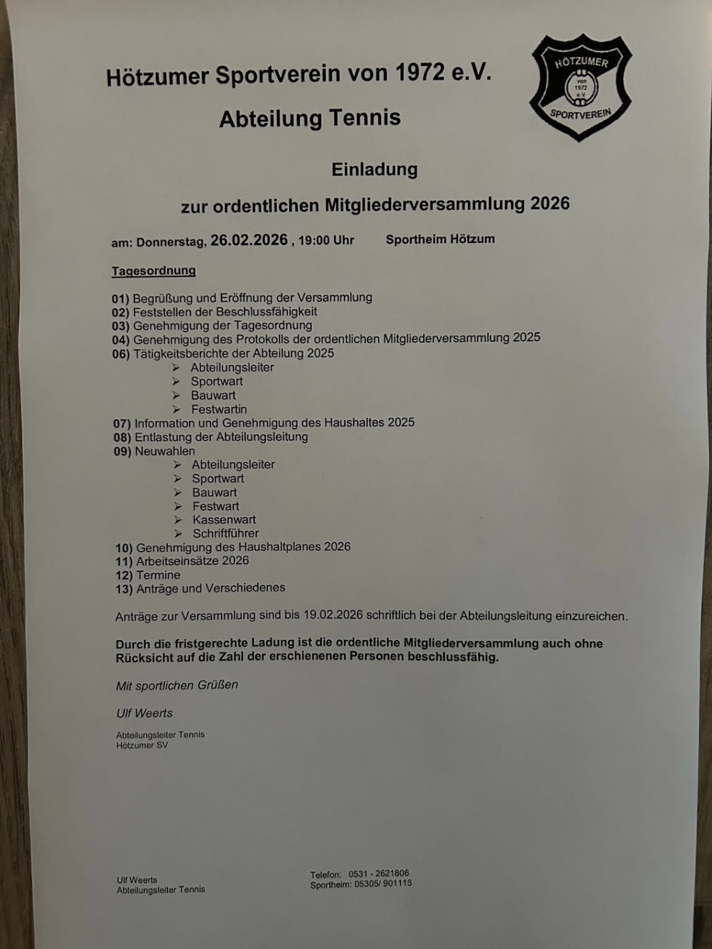 Der Vorstand des Hötzumer SV lädt zur ordenliche Mitgliederversammlung 2026 des Hötzumer SV ein: